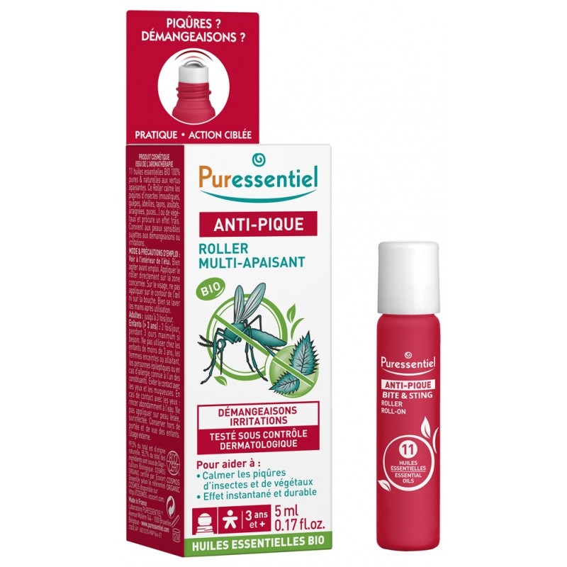 Puressentiel Anti-Pique Roller Apaisant Bio 5ml aux 11 huiles essentielles pures et naturelles, apaise et calme les peaux irritées par les piqûres.