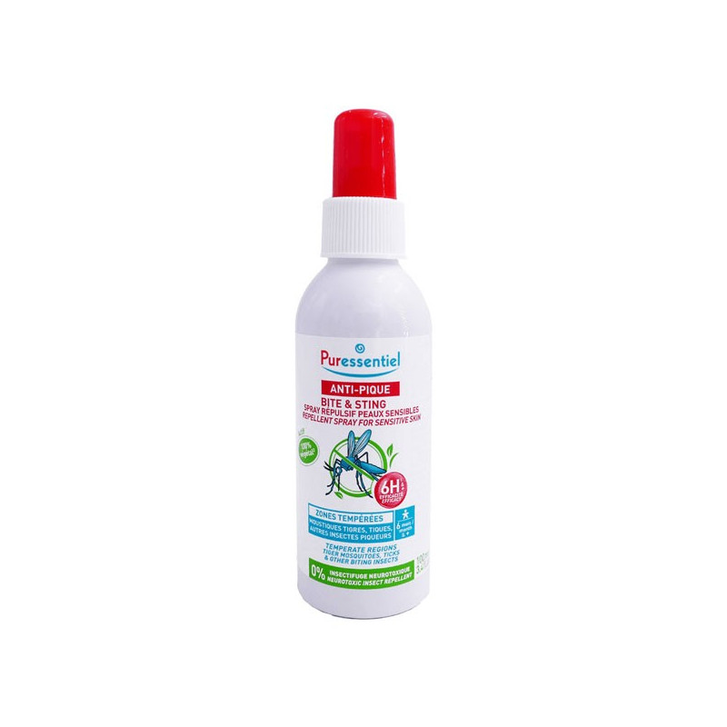 Puressentiel Spray Répulsif Peaux Sensible Anti Pique 100ml permet d'éviter les piqures d'insectes en zones tempérées.