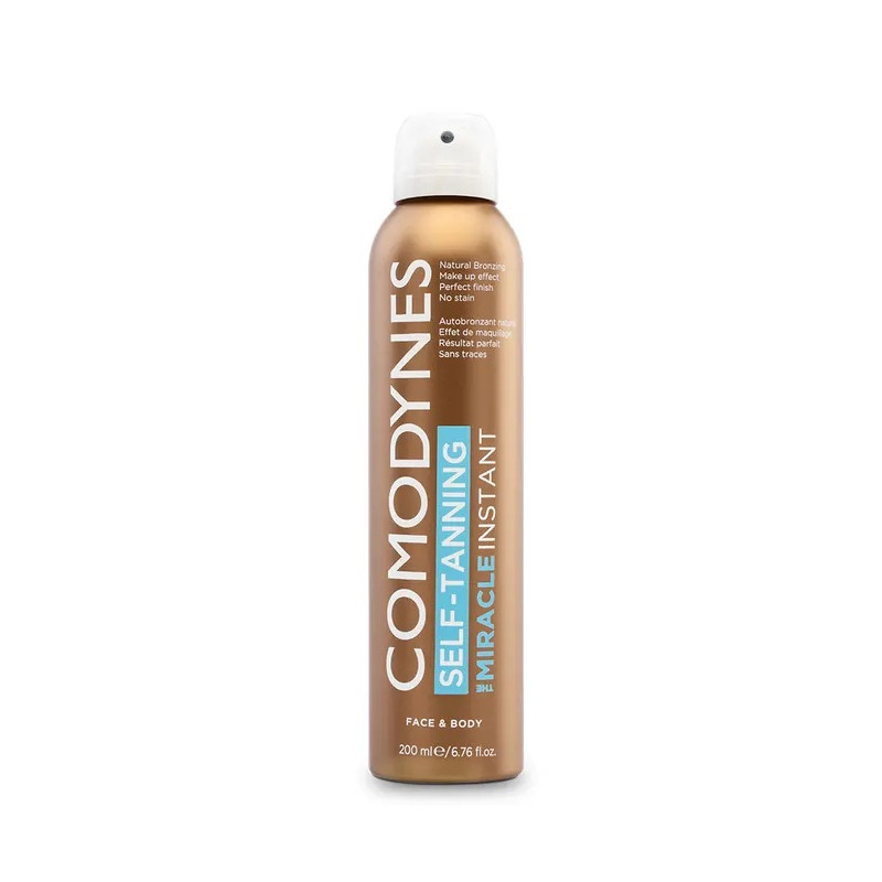 Comodynes présente le spray teinté autobronzant MIRACLE INSTANT. Obtenez un bronzage naturel au pigment caramel pour le visage et le corps. L'effet est visible instatannéement et peut durer jusqu'à 5 jours. Testé dermatologiquement