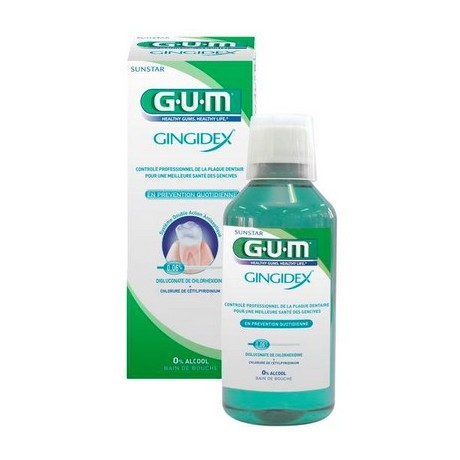 Le Bain de Bouche Gingidex 0,06% sans alcool de GUM aide à prévenir la formation de la plaque dentaire et des gingivites.