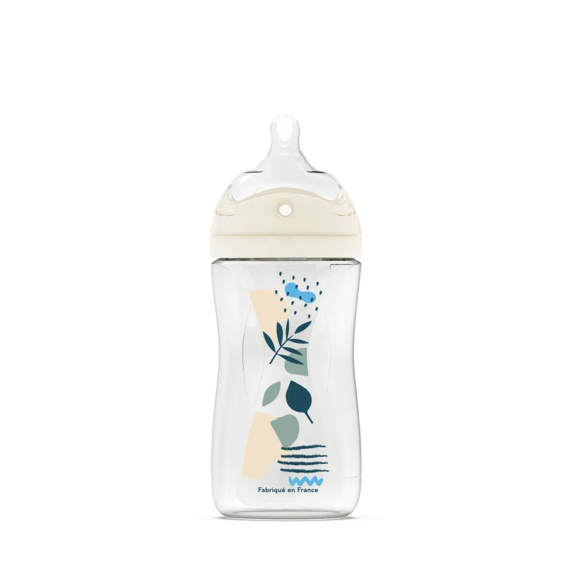 Le biberon a un débit 1 et la tétine dispose de plusieurs perforations afin de reproduire au mieux les canaux lactifères du sein.