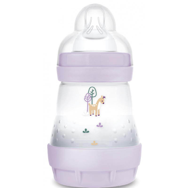 Pour le confort des bébés pendant la tétée, la marque MAM propose aux mamans, le biberon anti-colique de couleur Lila.