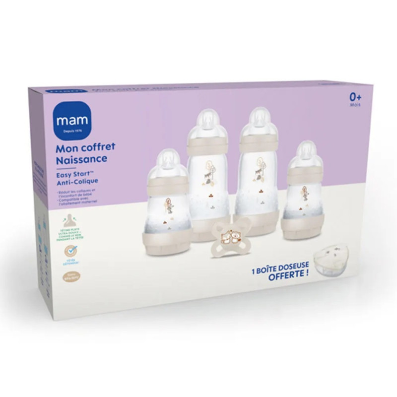 Le Coffret Naissance MAM Easy Start Anti Colique est le kit idéal pour les nouveaux-nés. Il contient 4 biberons (2 de 160ml et 2 de 260ml) avec tétines débit 1 et 2, une sucette naissance et une boîte doseuse de lait. Les biberons sont anti-colique et leur effet est prouvé.