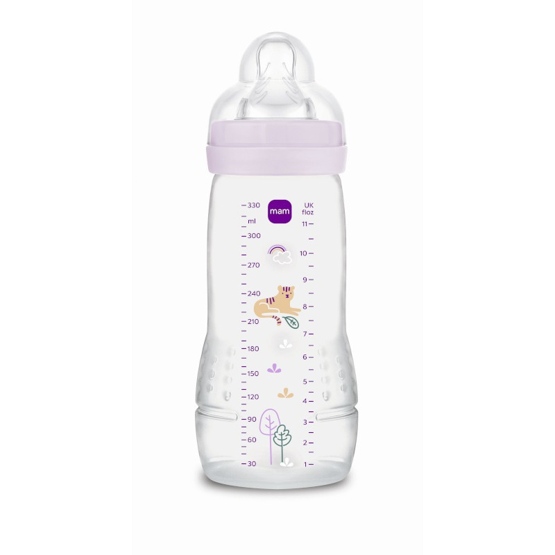 Le biberon MAM Easy Active 330 ml offre une prise en main facile et une tétine douce en silicone SkinSoft™ acceptée par 94 % des bébés !