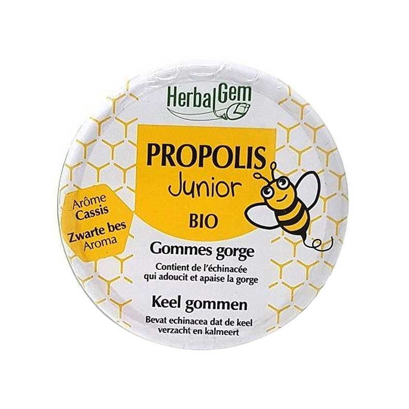 Propolis Junior Gommes Bio 45g est un complément alimentaire du laboratoire Herbalgem à base de Propolis, d'Échinacée, de Citron, d'Aulne, d'Orange Douce et d'huiles essentielles de Giroflier (Eugenia caryophyllata Thunb.), de Lemongrass (Cymbopogon citratus), de Cannelle de Chine (Cinnamomum cassia) et de Menthe Poivrée (Mentha × piperita). Ces ingrédients sont issus de l'Agriculture Biologique.