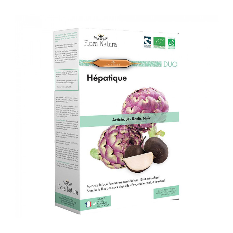 Flora Natura® Duo Hépatique Bio favorise le bon fonctionnement du foie. Il associe artichaut Bio et radis noir sous forme d’extraits fluides aqueux.
