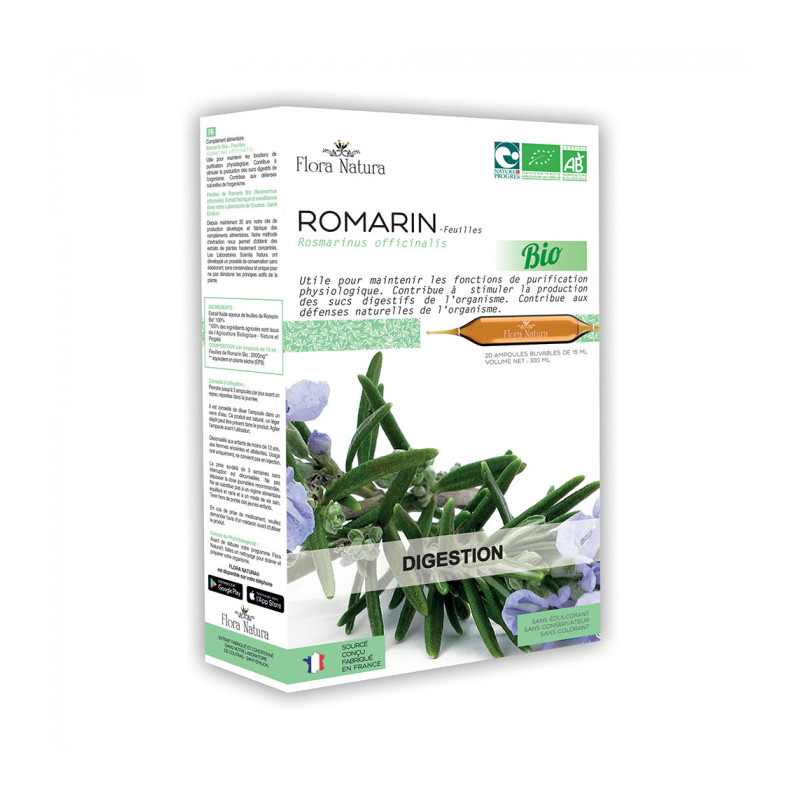 Le Romarin favorise la digestion. Il stimule la production de bile dans le vésicule biliaire (cholérétique) puis permet l'évacuation de celle-ci (cholagogue).