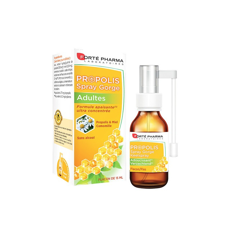 Propolis Adulte de Forte Pharma c'est un spray adoucissent pour la gorge. Aromatisé au miel et à l'huile essentielle d'eucalyptus, il est concentré en Propolis et en camomille pour apaiser efficacement les gorges les plus irritées.