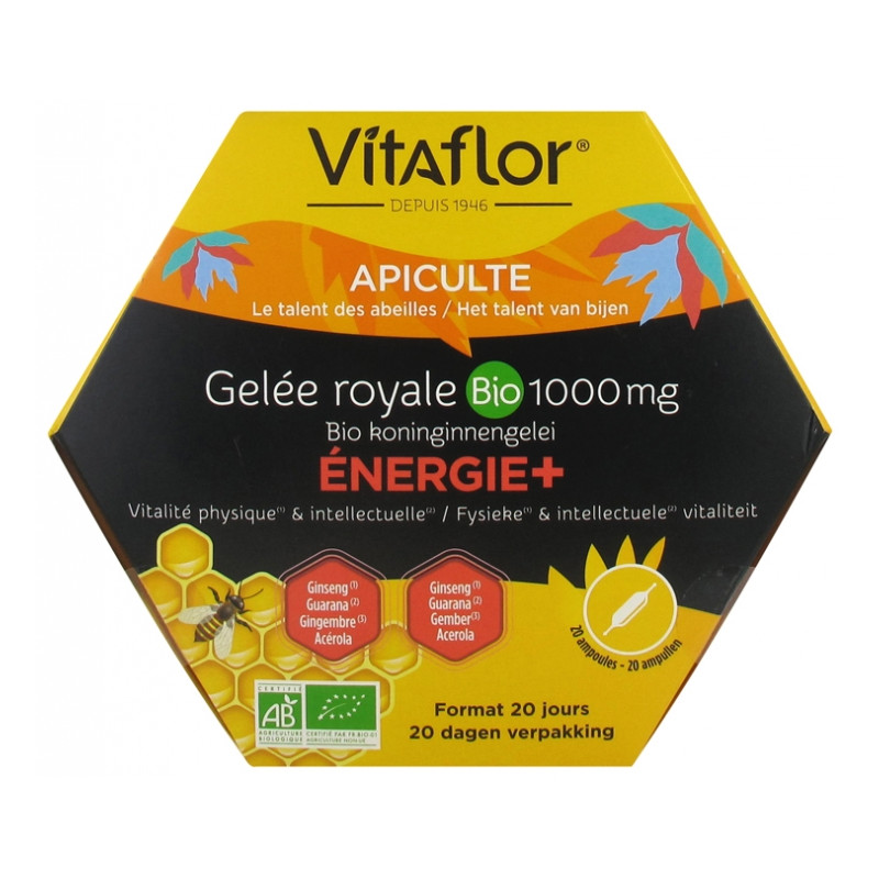 Vitaflor Gelée Royale Bio 1000 mg Énergie+ 20 Ampoules est un complément alimentaire à base de Gelée Royale et de plantes Bio.