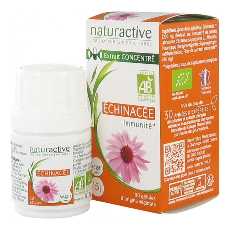 Naturactive Échinacée Bio 30 Gélules est un complément alimentaire à base d'échinacée, qui contribue au bon fonctionnement du système immunitaire.
