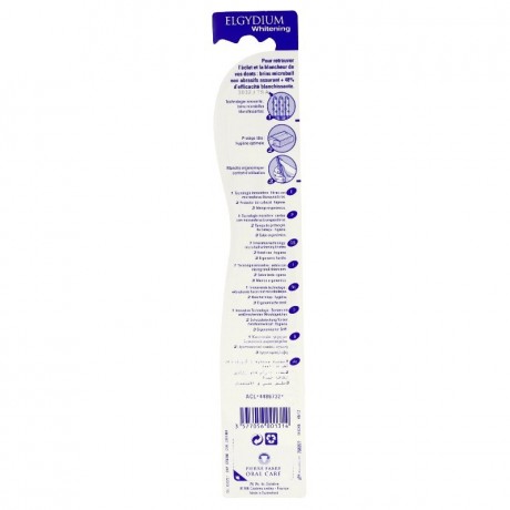 La brosse à dents Blancheur d'ELGYDIUM possède un Système Microball : incrustées le long de chaque brin, des microbilles non abrasives assurent lors du brossage un effet ultra polissant qui optimise l'élimination de la plaque dentaire et augmente l'efficacité blancheur de 48 % par rapport à une brosse classique.