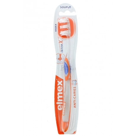 Elmex Anti-Caries Brosse à Dents InterX Souple est une brosse à dents qui possède des brins en X plus longs pour un nettoyage en profondeur des espaces interdentaires.