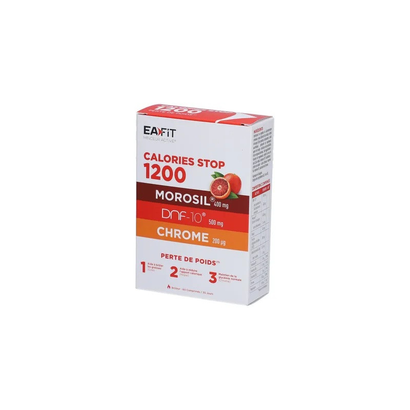 Eafit Calories Stop 1200 60 Comprimés est un complément alimentaire brûleur de graisses et réducteur d'apport calorique, dont la formule associe des plantes, des vitamines et une fibre prébiotique.