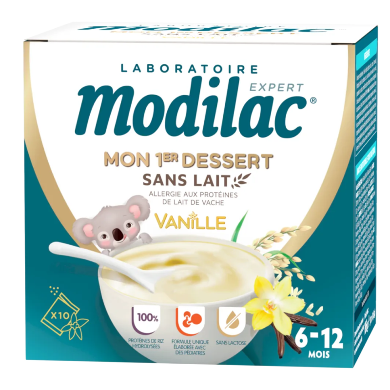 Mon 1er dessert Sans Lait Saveur Vanille de MODILAC a spécialement été développé pour aider bébé à développer ses papilles en découvrant de nouvelles saveurs. Ce dessert sans lait convient aux bébés de 9 à 12 mois. La formule de Mon 1er Dessert est sans protéine de lait de vache, ni lactose.