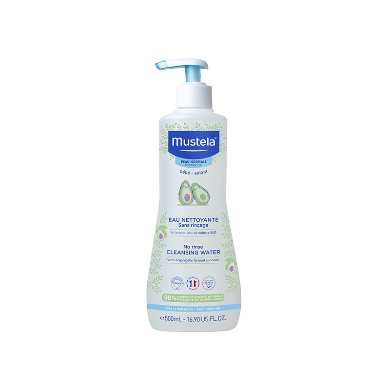 Mustela Eau Nettoyante sans rinçage pour le visage et le siège de bébé dès sa naissance.