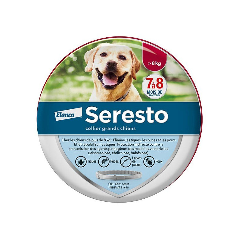 Seresto Grand Chien Collier Anti-Puces et Anti-Tiques est destiné à éliminer les tiques, puces, larves de puces, poux broyeurs chez les grands chiens.