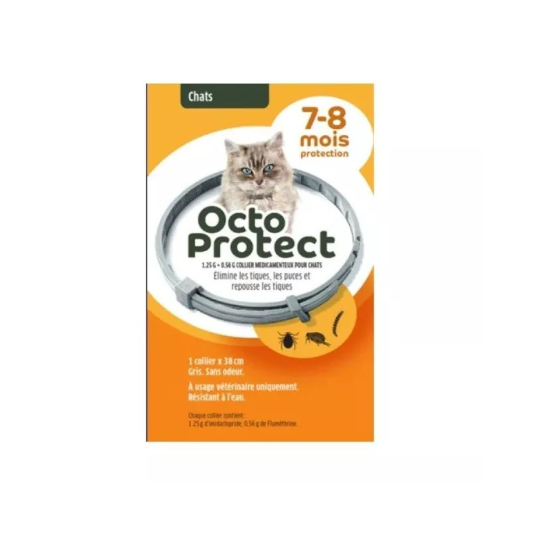 Le collier OCTOPROTECT protège efficacement votre chat contre les principaux parasites jusqu'à 8 mois. Sa double action insecticide et répulsive agit sur les puces, tiques, poux broyeurs et phlébotomes, limitant ainsi le risque de maladies comme la Leishmania infantum.