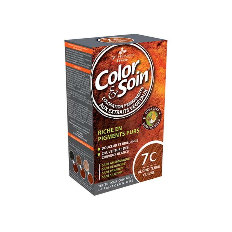 Enrichie en protéines végétales et en huiles essentielles, Color&Soin colore parfaitement le cheveu tout en le rendant soyeux et ce, sans l'alourdir ! Teinte BLOND TERRE CUIVRÉ - 7C Sans Ammoniaque, sans Résorcine, sans Paraben et sans Silicone.