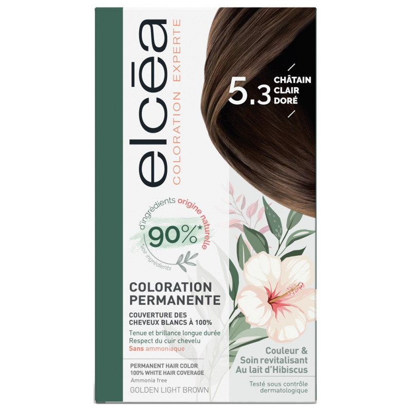 Elcéa Coloration Experte Permanente - Coloration : 5.3 Châtain Clair Doré est une coloration permanente qui couvre en totalité les cheveux blancs dès la première application tout en respectant la nature des cheveux. Elle assure : Une couverture des cheveux blancs à 100%. Une tenue et une brillance longue durée. Le respect et le confort du cuir chevelu. Un résultat professionnel. Agréablement parfumé, le Soin Revitalisant a été spécifiquement formulé au lait d'hibiscus reconnu pour stimuler la fibre capillaire, il renferme également un filtre UV. Les cheveux sont souples et revitalisés, protégés des agressions extérieures et des effets nocifs du soleil. L'éclat de la couleur est renforcé, les cheveux sont nourris et doux. La couleur est lumineuse et naturelle.
