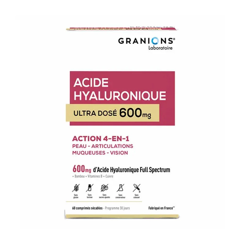 - 600 mg d’Acide Hyaluronique, pour hydrater en profondeur, améliorer l’élasticité, réduire les signes de l’âge et aider à prévenir les rides.