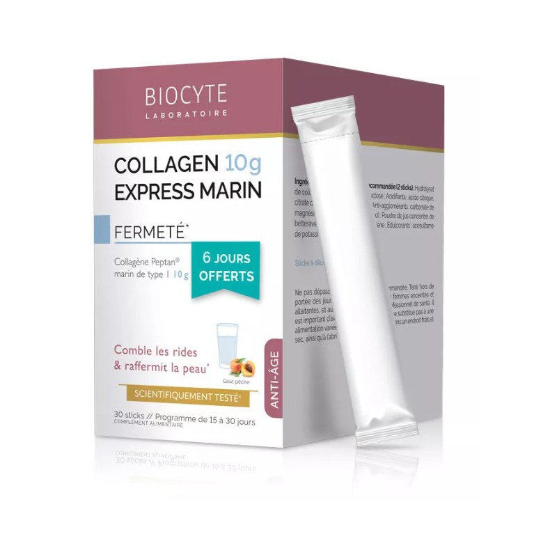 Biocyte Collagen Express Marin agit sur la profondeur des rides grâce à l’efficacité anti-âge du collagène. Avec 10g de collagène par jour (2 sticks), les signes de l’âge sont retardés et le capital jeunesse de la peau est préservé.