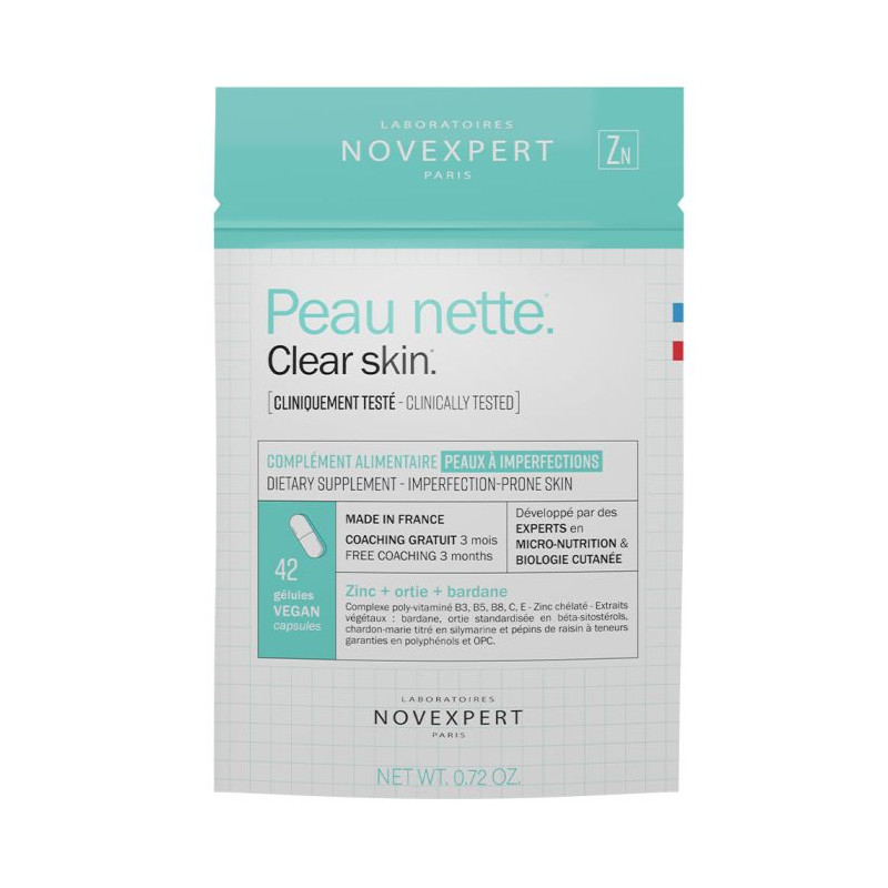 Formulé par les scientifiques Novexpert pour réduire les imperfections et matifier la peau, le complexe Peau nette traite à la fois les causes et les symptômes pour un effet immédiat et long terme. Le zinc diminue par exemple l’activité de l’enzyme qui transforme la testostérone en hormone pro-imperfections. Côté symptômes, les extraits d’Ortie et de Chardon Marie boostés limitent l’inflammation ainsi que l’oxydation pour réduire la sévérité des imperfections.