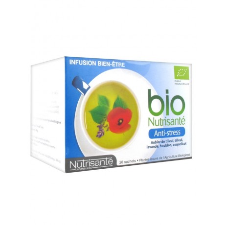 Nutrisanté Infusion Bio Anti-Stress 20 Sachets est une préparation pour infusion à base de plantes, préconisée pour vous aider à retrouver bien-être et sérénité et lutter contre le stress.