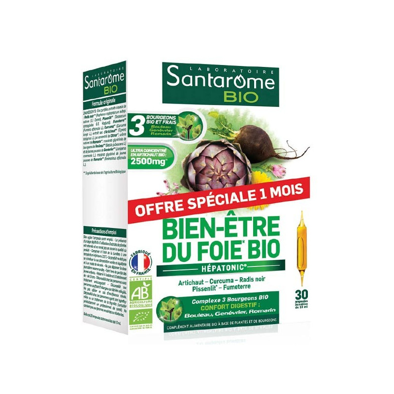 Santarome Bio Bien-Être du Foie Bio 30 Ampoules est un complément alimentaire buvable pour le bien-être du foie.