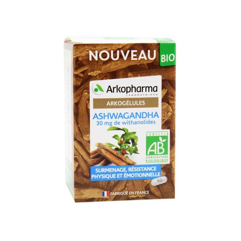 Arkogélules Ashwagandha Bio 60 gélules est un complément alimentaire du laboratoire Arkopharma à base d'extrait d'Ashwagandha, issu de l'Agriculture Biologique.