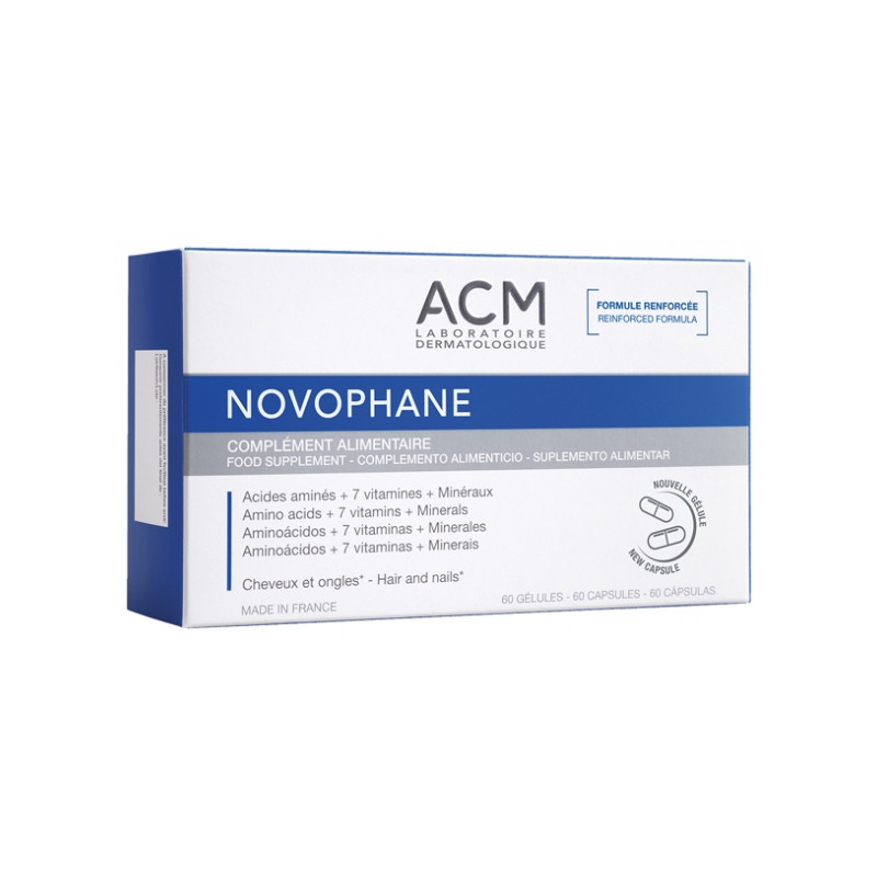 Laboratoire ACM Novophane 60 Gélules est un complément alimentaire à base d'acides aminés, de 7 vitamines et de minéraux.