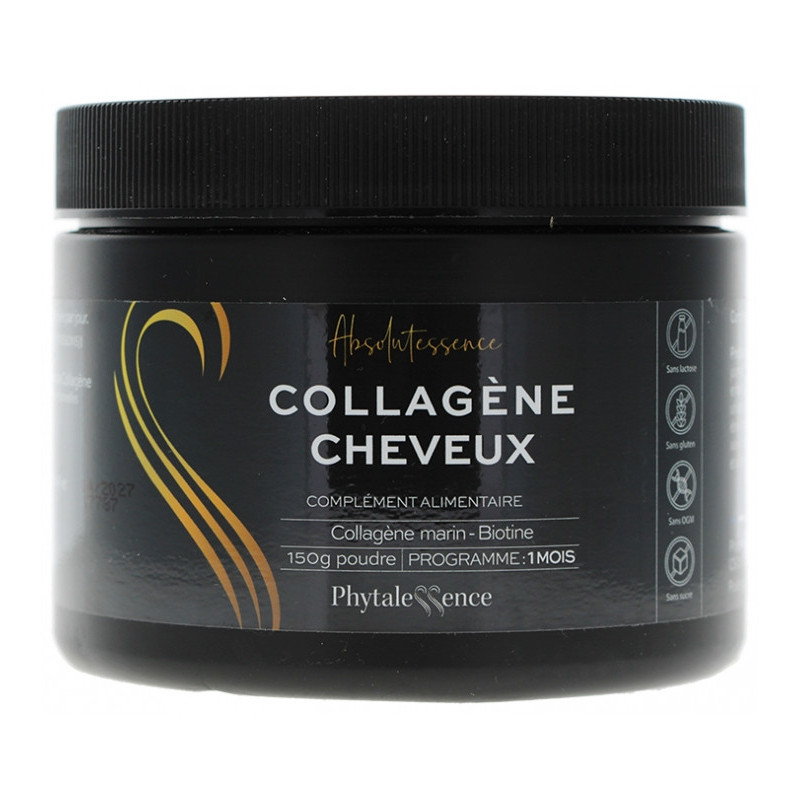 Phytalessence Absolutessence Collagène Cheveux 150 g est un complément alimentaire pour les cheveux à base de collagène marin et de biotine . Il contribue à la santé des tissus, musculaires, articulaires et cutanés, ils contribue à réduire le vieillissement de la peau.