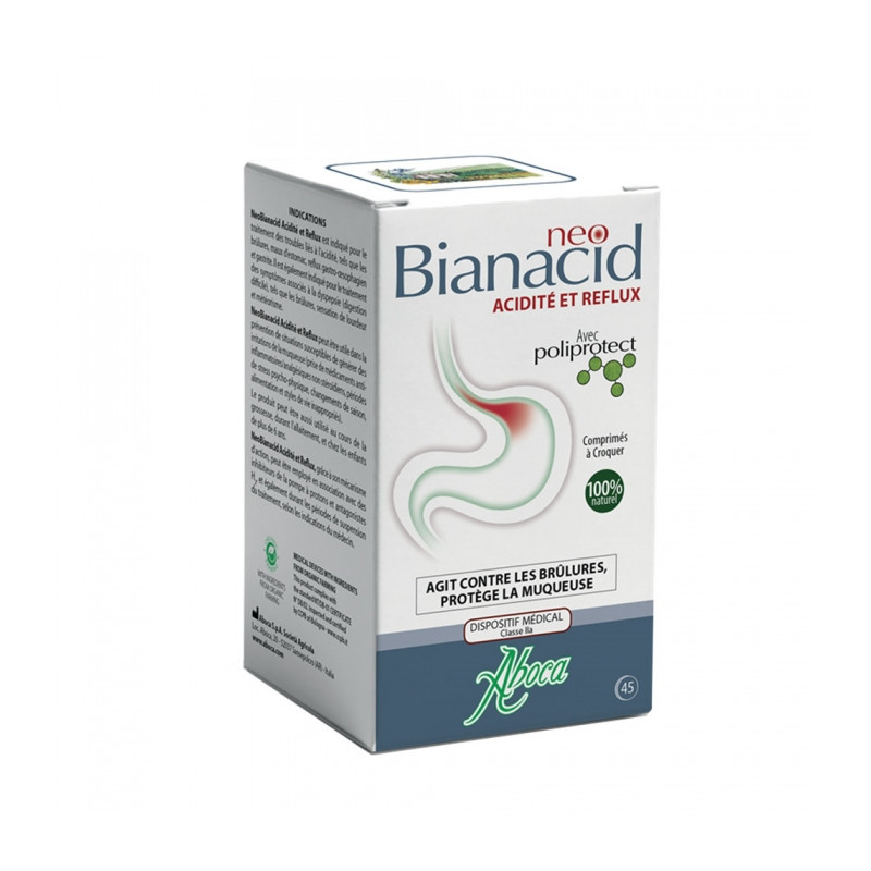 Aboca NeoBianacid Acidité et Reflux 45 Comprimés est un dispositif médical à base de complexes minéraux et végétaux, offrant une action protectrice et apaisante sur la muqueuse gastro-œsophagienne, permettant de lutter contre les brûlures, les maux d'estomac, la sensation d'acidité, symptômes de l'irritation et de l'inflammation de la muqueuse.