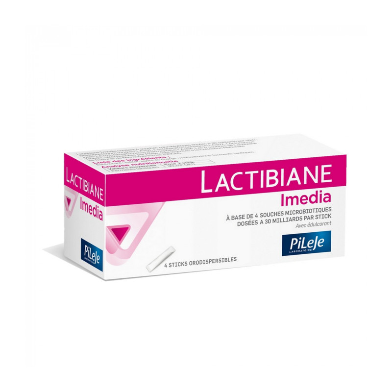 Lactibiane Imedia est composé de 4 souches microbiotiques dosées à 30 milliards par stick orodispersible.