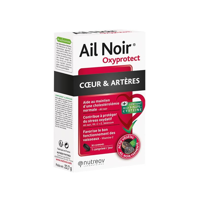 Nutreov Ail Noir Oxyprotect Coeur et Artères 30 Comprimés est un complément alimentaire sans odeur à base d'extrait d'ail noir fermenté qui aide au maintien d'une cholestérolémie normale, contribue à protéger du stress oxydatif et favorise le bon fonctionnement des vaisseaux.