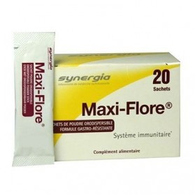 Synergia Maxi-Flore est un complément alimentaire qui contribue à régénérer la flore intestinale en apportant les principaux ferments lactiques, protégés de l'acidité gastrique par une technique d'enrobage spécifique. Maxi-Flore régénère et stimule l'immunité de la flore intestinale, contribue à rééquilibrer le transit et aide à une bonne assimilation des nutriments. Particulièrement conseillé dans les suites d'antibiothérapie et en cure chez la personne âgée, il contribue aussi à la prévention des « turistas ». Ce complément alimentaire aux probiotiques composé de 4 souches de probiotiques associées à de la vitamine D. Maxi-Flore Orodispersible est une synergie optimale de probiotiques qui s'appuie sur plus de 51 études cliniques, 38 études in Vivo et 34 études in Vitro. Un procédé d'encapsulation permet la protection des souches probiotiques dans les conditions difficiles comme lacidité gastrique ou les chocs thermiques. Ce procédé multiplie la résistance à lacidité gastrique par 1000. La forme orodispersible est particulièrement pratique pour tout le monde et dans toutes les situations. La poudre du sachet se consomme directement dans la bouche. Le produit se dissout quasi instantanément avec un goût prune très agréable. Chaque indication est justifiée par une ou plusieurs études cliniques : Assainit la flore en réduisant lintensité des troubles gastro-intestinaux. Réduit les symptômes du syndrôme du colon irritable (SCI). Améliore lélimination des Candidas Albicans. Efficace contre les infections vaginales. Participe à léquilibre de la flore intestinale et des défenses naturelles.