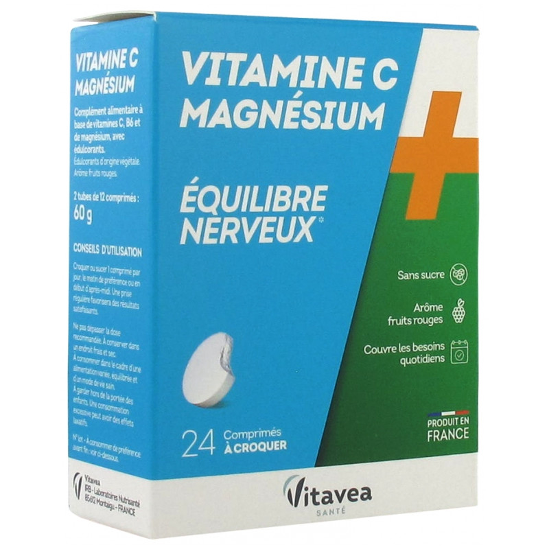 Vitavea Vitamine C Magnésium 24 Comprimés à Croquer est un complément alimentaire à base de vitamines C, B6 et de magnésium, avec édulcorants, à l'arôme fruits rouges.
