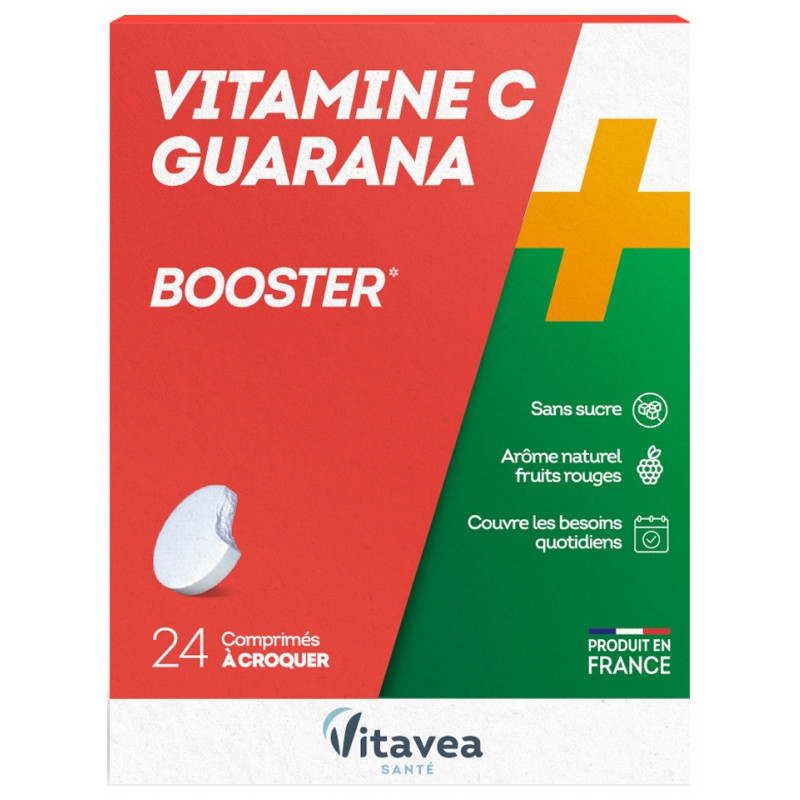 Nutrisanté Booster Vitamine C + Guarana 24 Comprimés est un complément alimentaire à base de vitamine C et d'extrait de plantes, avec édulcorants, à l'arôme naturel fruits rouges.