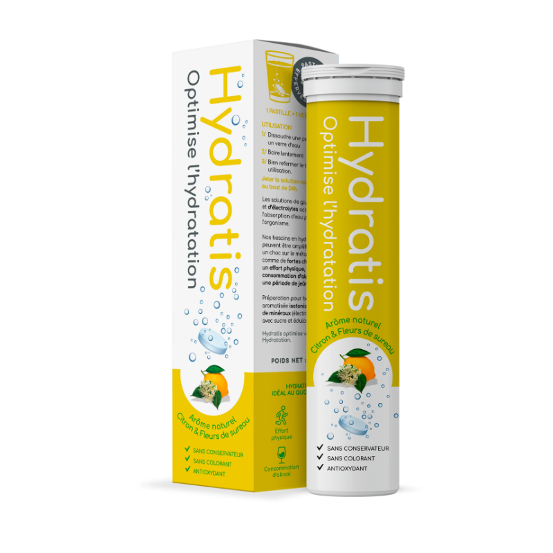 Les comprimés effervescents Hydratis sont une préparation servant à réaliser des boissons aromatisées isotoniques. Ils sont simplement à dissoudre dans l'eau d'un verre ou d'une gourde. Les électrolytes qu'ils intègrent vont contribuer à une bonne absorption de l'eau. Hydralis est peu sucré et contient plusieurs sels minéraux hydratants.