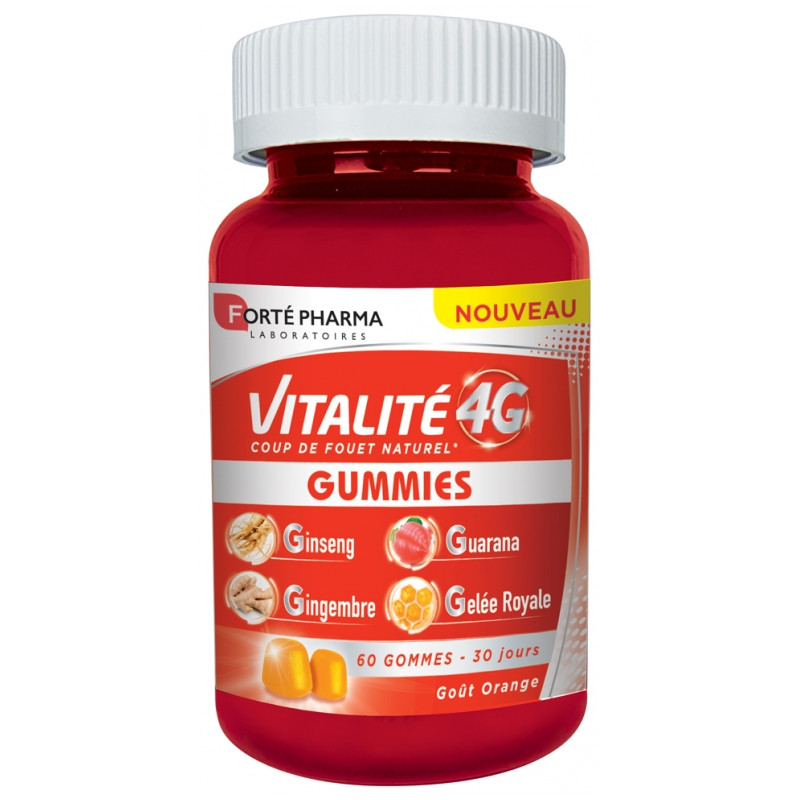 Forté Pharma Vitalité 4G 60 Gummies est un complément alimentaire qui associe le guarana, le ginseng, la gelée royale et le gingembre dans des gummies à base de pectine de fruit pour booster l'énergie.