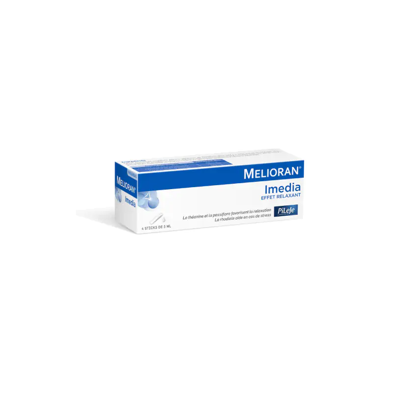 Melioran® Imedia est destiné aux personnes ayant besoin d’un effet relaxant dans le cas d’un stress ponctuel ou d’anticipation grâce à sa composition à base de L-théanine, d'extraits de passiflore et de rhodiole.