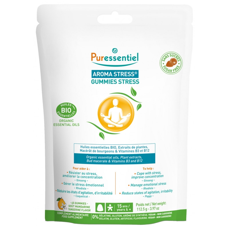Puressentiel Aroma Stress 45 Gummies est un complément alimentaire contenant une synergie exclusive d'actifs brevetée associant des huiles essentielles Bio HEBBD, des extraits de plantes, un macérat de bourgeons à un complexe vitaminique pour aider à réduire les états d'agitation et améliorer la concentration. Il est idéal pour un usage quotidien et lors des situations de stress passager.