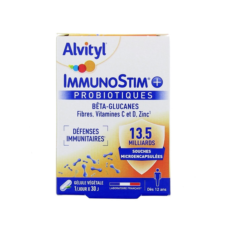 Alvityl ImmunoStim+ Probiotiques est constitué de probiotiques, de fibres, de zinc, de vitamines C & D et des bêta-glucanes pour favoriser les défenses immunitaires de l'organisme.