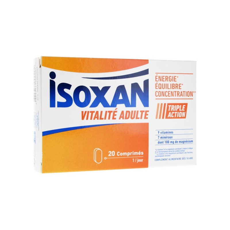 Isoxan Adulte est un complément alimentaire spécialement conçu dans le respect des apports nutritionnels conseillés pour contribuer à l'équilibre nutritionnel en vitamines, en minéraux et en oligo-éléments. Il est indiqué pour les adultes actifs, en particulier dans les situations :