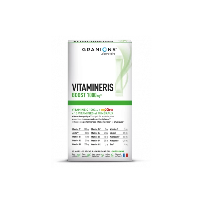 Vitamineris Boost 1000 mg est un complément alimentaire des laboratoires Granions pour un boost énergétique, la concentration, la vigilance, et les performances intellectuelles et physiques.