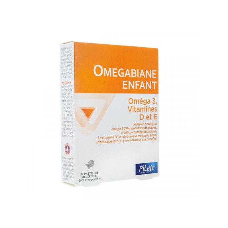 La prise d'Omegabiane enfant de Pileje est facilitée par sa galénique innovante qui consiste en des pastilles gélifiées sous forme de petits poissons, ces dernières ne nécessitant pas d'eau pour être ingérées. Elles apportent 140 milligrammes de DHA (acide docosahexaénoïque) et 28 milligrammes d'EPA (acide eicosapentaénoïque) par jour, ainsi que de la vitamine E et de la vitamine D3. Cette dernière contribue à la croissance et au développement osseux normaux chez l'enfant.Packaging :