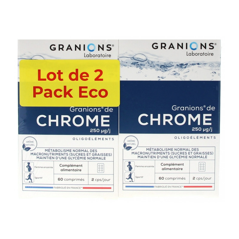Granions Chrome 250 µg Lot de 2 x 60 Comprimés est un complément alimentaire à l'arôme naturel d'orange et à base de chrome, un oligoélément essentiel pour le métabolisme des macro-nutriments (glucides et lipides). Il contribue au maintien d'une glycémie normale.