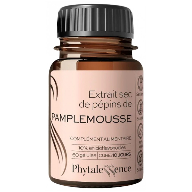 Phytalessence Extrait de Pépins de Pamplemousse 60 Gélules est un complément alimentaire à base d'extrait sec de pépins de pamplemousse, titré à 10% en bioflavonoïdes.