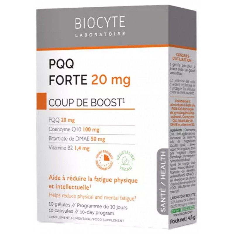 Découvrez Biocyte PQQ Forte 20mg, un complément naturel en gélules pour un coup de boost énergétique. 10 gélules pour revitaliser votre quotidien !