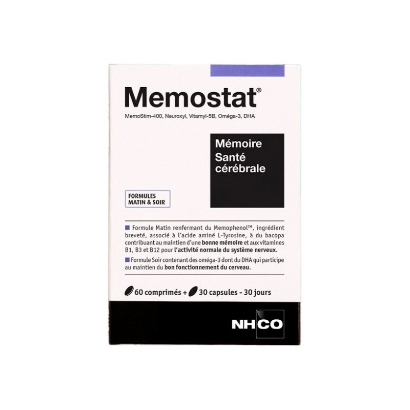 NHCO Memostat Mémoire Santé Cérébrale 60 Comprimés + 30 Capsules est un complément alimentaire conçu pour soutenir la santé cérébrale et la mémoire. Il renferme deux formules de micronutrition élaborées pour le maintien des fonctions cognitives normales. La formule du comprimé matin intègre : Le complexe MemoStim-400 associe la L-Tyrosine et le bacopa pour soutenir la santé cérébrale et cognitive, contribuant ainsi au maintien d'une mémoire optimale. Le complexe Neuroxyl, quant à lui, contient l'ingrédient breveté Memophenol™ qui aide à protéger les membranes cellulaires et les vaisseaux sanguins contre les dommages des radicaux libres, ainsi que la vitamine B5 qui soutient les performances intellectuelles. Enfin, le complexe Vitamyl-5B regroupe des vitamines B essentielles au bon fonctionnement du système nerveux et au métabolisme normal de l'homocystéine.