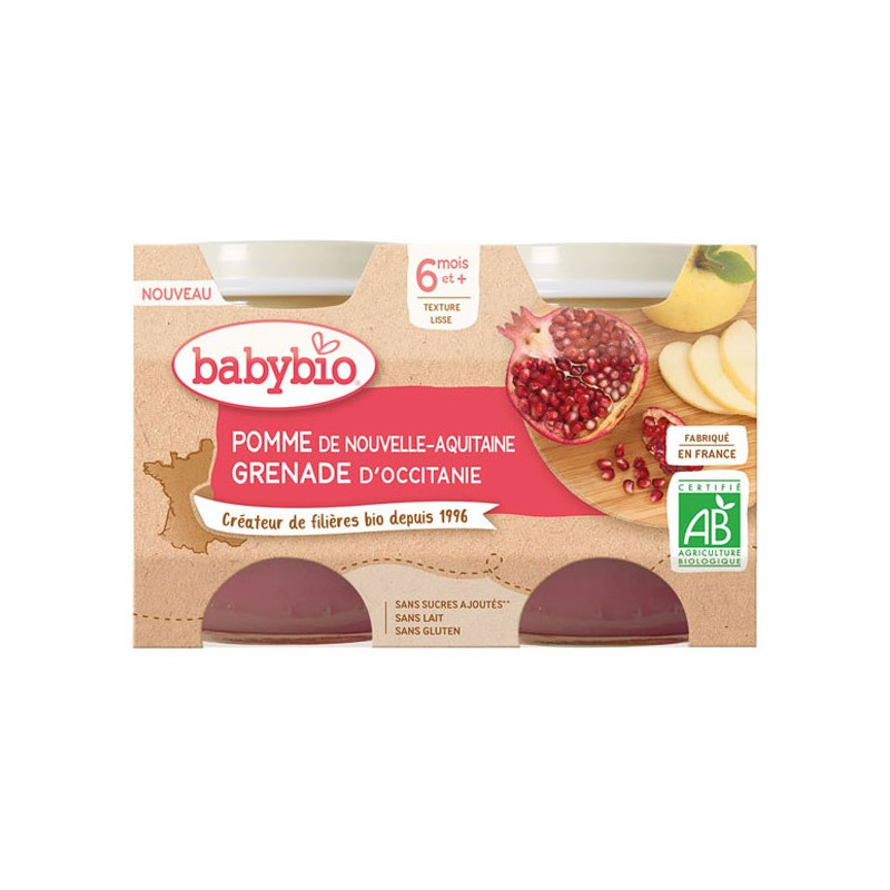 Babybio Fruits Pot Pomme Grenade +6m Bio 2 x 130g sont de petits pots de purée de fruits savoureux qui mêlent la douceur des pommes aux notes acidulées de la grenade.